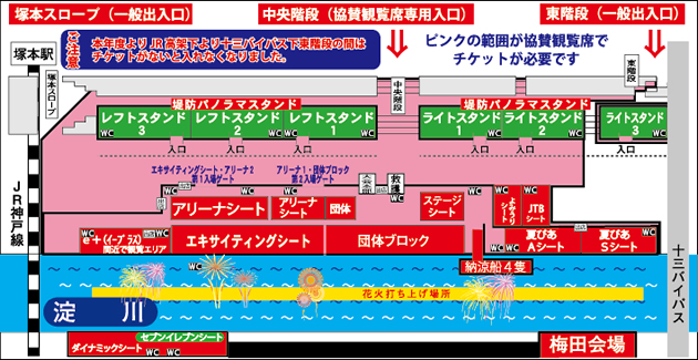 上記の通り、最寄りの駅は「阪急電鉄十三駅」、もしくは淀川を挟んで向かい側の「阪神電鉄野田阪神駅」、または「大阪駅」、「梅田駅(JR、地下鉄、私鉄など)」となり、付近の淀川の河川敷、もしくは水上から打ち上げられます。